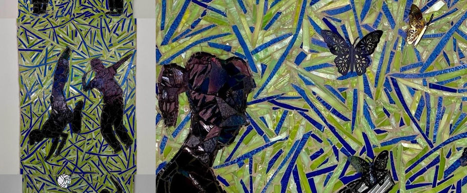 ![]() After FogStained glass, ceramic tile, mirror, agate on board 24” x 36” $850 | ![]() Vanishing LandscapeStained Glass on Glass 27" x 67" $5500 |